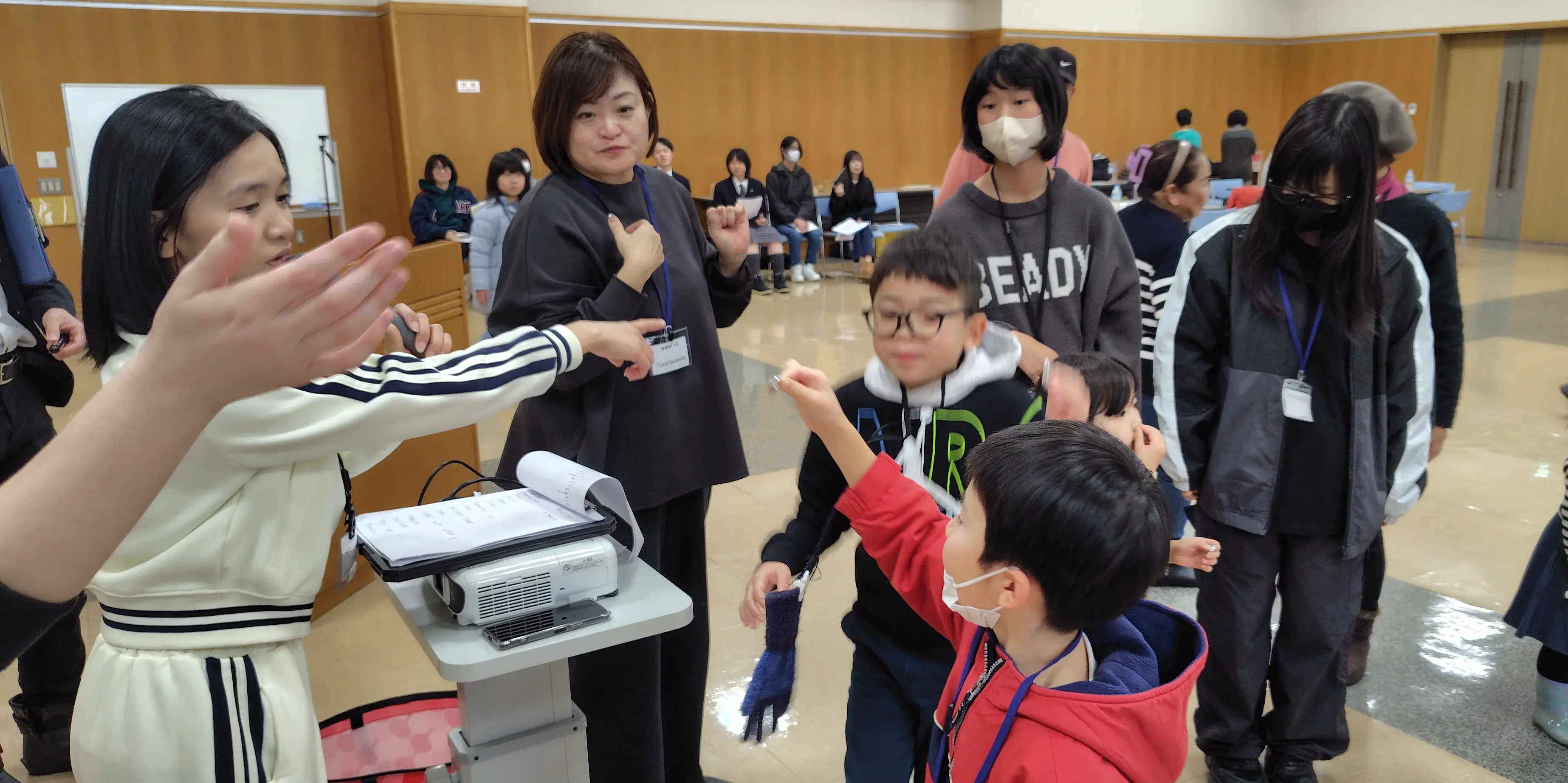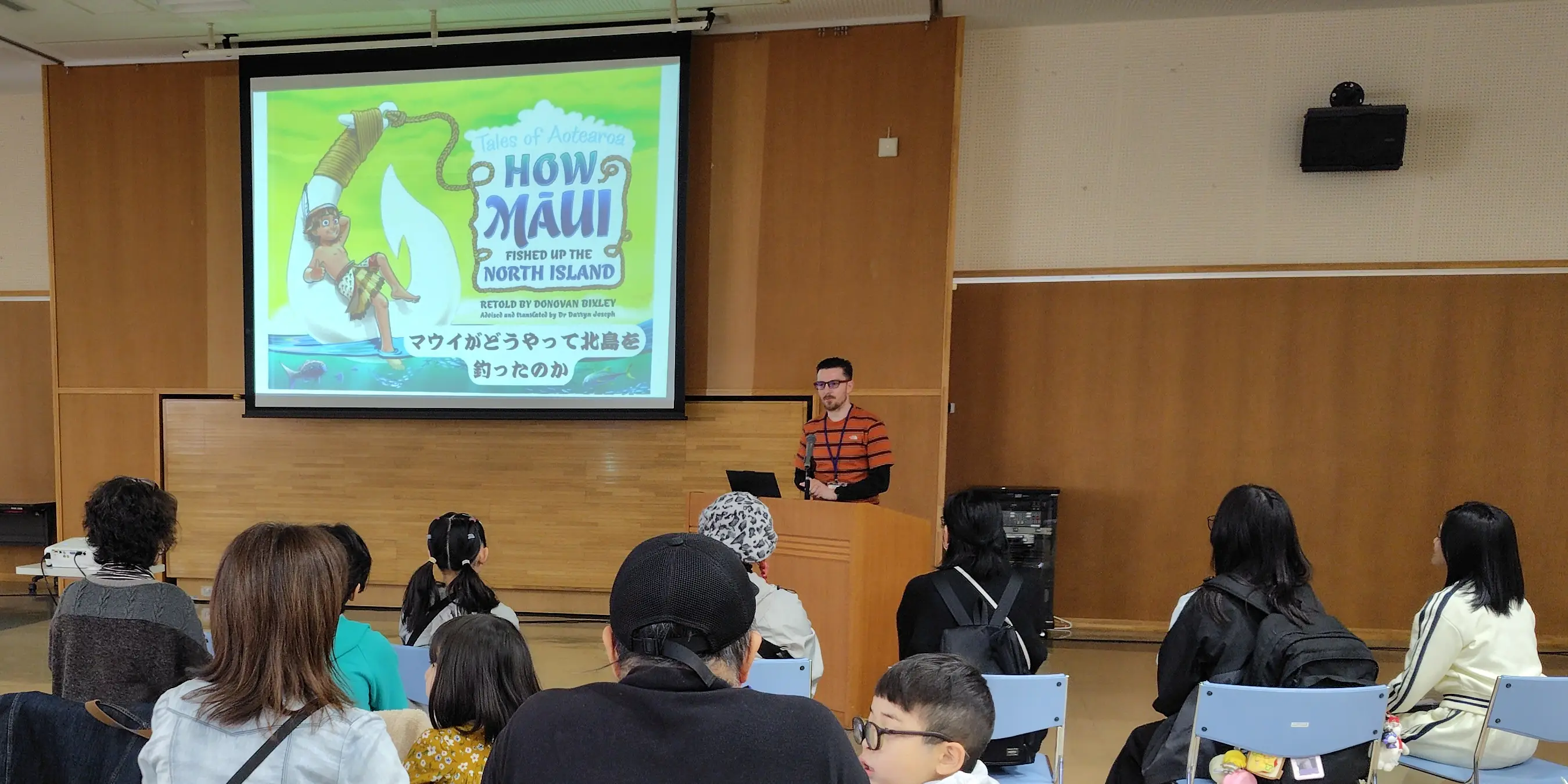最初に、ニュージーランド出身である外国語指導助手(ALT)のローガン先生は、ニュージーランドのマウイの神話を読み聞かせ、ケイ先生は小学校時代はどんなことをして遊んでいたのかを紹介。さらに、一般社団法人深川青年会議所(深川JC)のフィリピン出身である宮田ジャスミンさんもスピーチ。彼女の母国での生活、現在の深川での仕事、深川JCについて話してくれました。